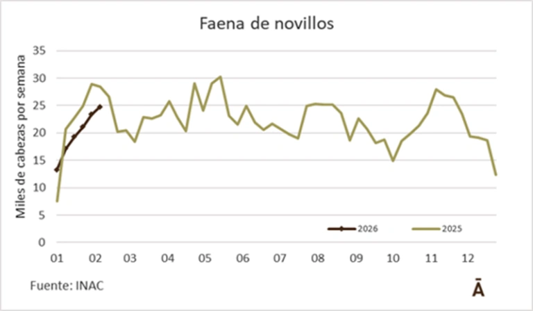 INAC informó que en la semana al 7 de febrero ingresaron a planta 51.957 vacunos, 2.509 más (5%) que el dato corregido de la anterior, aunque sigue evolucionando por debajo del año pasado. Fue la mayor cantidad en 11 semanas, desde mediados de noviembre.